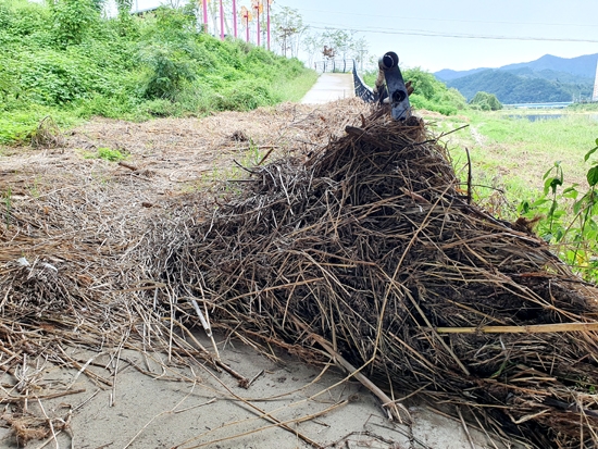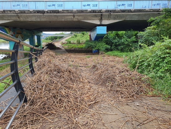 전천교 밑 호우로 휩쓸려온 수풀로 ‘흉물’