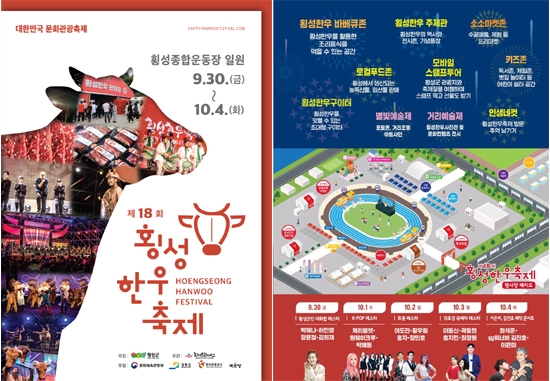 횡성군이 주최하고 횡성문화재단이 주관하는 제18회 횡성한우축제는 ‘횡성에서 맛보소(牛) 한우축제 즐기소(牛)’를 슬로건으로 오는 9월 30일부터 10월 4일까지 5일간 횡성종합운동장 일원에서 펼쳐진다.