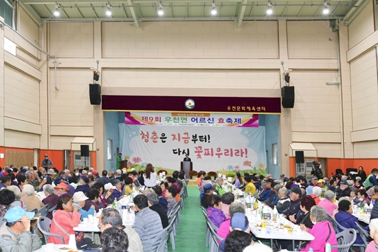 | ↑↑ 우천면 새마을부녀회(회장 홍정숙)가 주관한 우천면 어르신 효축제가 지난 12일 오전 11시 우천문화체육센터에서 열렸다. |