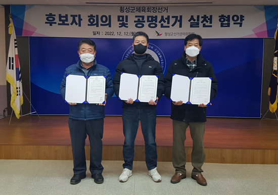 | ↑↑ 횡성군체육회장 선거 후보자들이 지난 12일 오후 횡성군선관위 회의실에서 공명선거 실천 협약식을 가졌다. 기호3 박명서 후보, 기호2 전기택 후보, 기호1 정명철 후보. (좌측부터) |