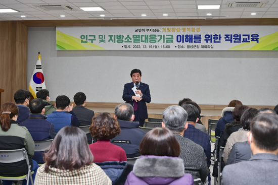 | 횡성군은 2024 지방소멸대응기금 사업발굴과 생활인구 유입방안을 모색하기 위한 첫 출발로 횡성군청 실·과·소 팀장 90명을 대상으로 지난 19일 군청 대회의실에서 인구 및 지방소멸대응기금 이해를 위한 직원교육을 실시했다.
