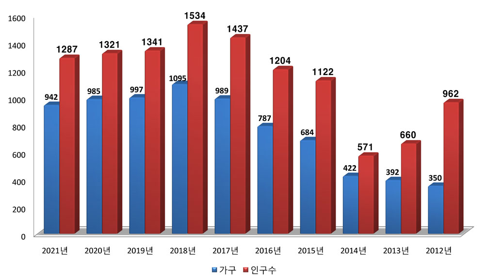 2018년엔 1,095가구 1,534명까지 들어왔고, 그 이후 2019년부터는 감소 추세를 보이고 있다. 2022년도는 올해 2월 말쯤집계될 예정이다.