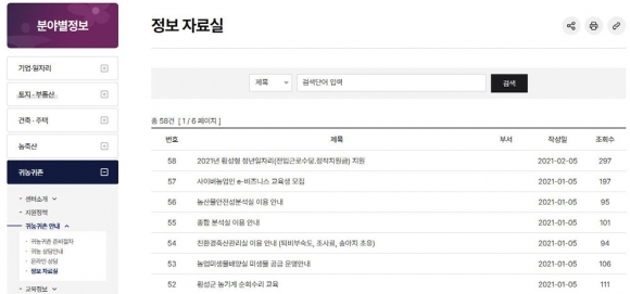 | ↑↑ 귀농귀촌 홈페이지 귀농귀촌 정보자료실에는 2021년 2월초 이후 올라온 자료는 없다. |