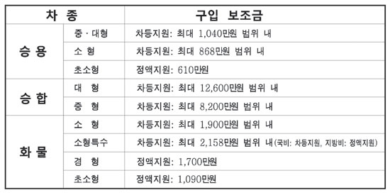 추가보조금으로는 택시 국비 200만원, 차종에 따라 차상위 이하 계층 구매 시 국비 10∼30%, 어린이 통학차량용 승합차 구매 시 국비 500만원 등이 지원된다.