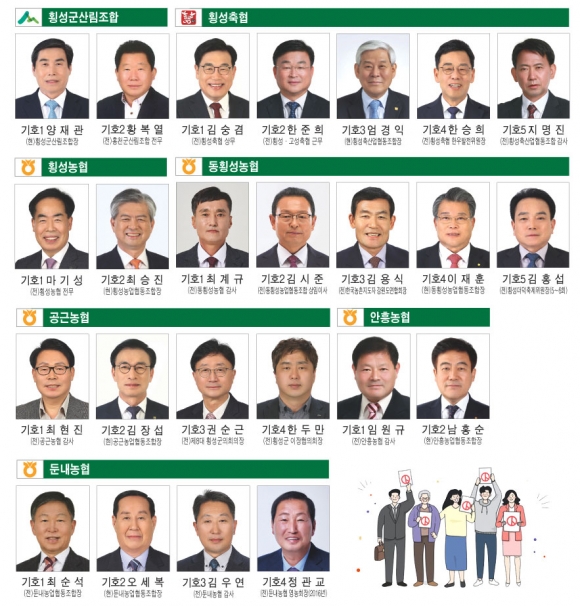 《횡성축산업협동조합》 △기호1 김숭겸(61세) (전)횡성축협 상무 △기호2 한준희(51세) (전)횡성·고성축협 근무 △기호3 엄경익(66세) (현)횡성축산업협동조합장 △기호4 한승희(56세) (전)횡성축협 한우발전위원장 △기호5 지명진(55세) (전)횡성축산업협동조합 감사