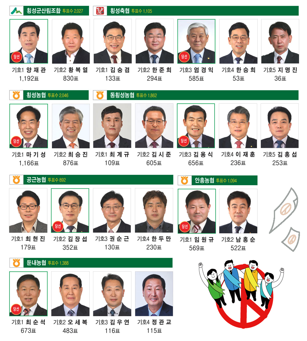 현직에서 낙마한 인물은 횡성농협의 최승진 조합장, 둔내농협 오세복 조합장, 안흥농협 남홍순 조합장, 동횡성농협의 이재훈 조합장이 고배를 마셨다.