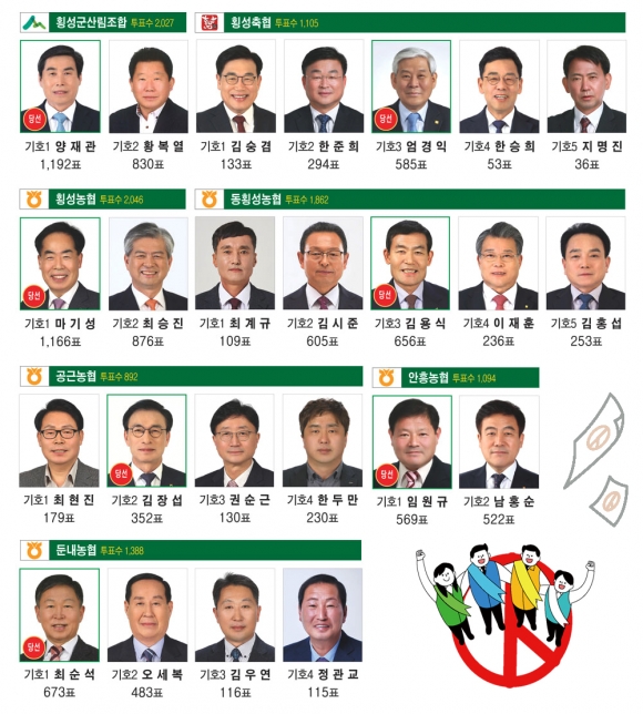 《횡성농협》 선거인수 2,453명, 투표수 2,046명, 후보자별 득표수(득표율) △마기성 1,166표(57.10%) △최승진 876표(42.89%)