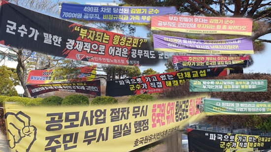 이곳 현수막은 ‘파국으로 가고 있는 단체교섭 군수가 직접 해결하라’, ‘490표 차로 당선된 김명기 군수 700여명 공무직, 비정규직과 가족 우습게 보지마라’, ‘공모사업 절차 무시, 주민 무시 밀실 행정, 호국원 유치 횡성군은 즉각 철회하라’ 등의 문구가 적혀있다. 현수막 지정 게시대가 아닌 군청 주변에 장기간 현수막이 어지럽게 걸려있어 군민의 따가운 눈총을 받고 있다.