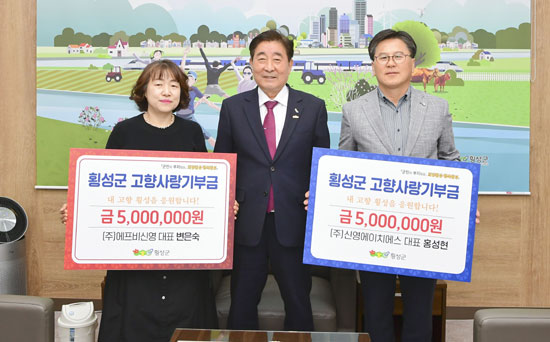 횡성군 제1호 고액기부자 주인공은 ㈜신영에이치에스 대표 홍성현, ㈜에프비신영 대표 변은숙 부부로 고향사랑기부제 최고 한도금액인 500만원을 4월 1일 김명기 군수에게 전달했다.