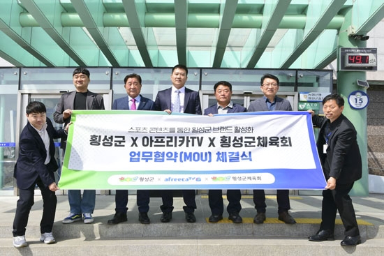 | 지역 스포츠 활성화 및 홍보를 위한 업무협약을 체결했다. 횡성군은 지난 10일 오후 2시 군수집무실에서 김명기 군수, 박명서 횡성군체육회장, ㈜아프리카TV 소셜미디어사업부 이민원 상무, 관계자가 참석한 가운데 진행했다.