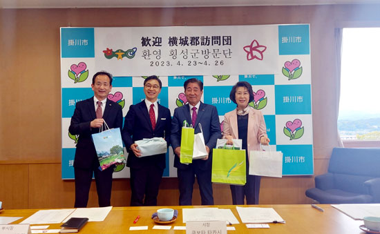 | 횡성군은 실효성이 저하된 국제 자매도시 사업에 대한 협의를 통해 내실 있는 국제교류 사업을 추진하고, 우호교류를 강화하고자 김명기 군수, 김영숙 군의장, 최동섭 자치행정과장 등 횡성군 대표단 7명은 4월 23일 오후 자매도시인 일본 시즈오카현 가케가와시로 출국해 4월 27일 4박 5일간의 일정을 끝내고 귀국했다.