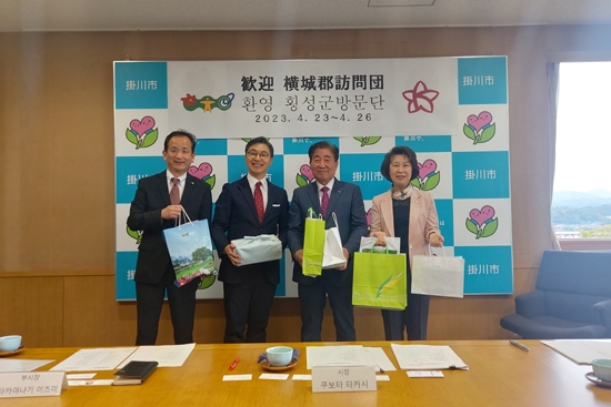 | 횡성군은 실효성이 저하된 국제 자매도시 사업에 대한 협의를 통해 내실 있는 국제교류 사업을 추진하고, 우호교류를 강화하고자 김명기 군수, 김영숙 군의장, 최동섭 자치행정과장 등 횡성군 대표단 7명은 4월 23일 오후 자매도시인 일본 시즈오카현 가케가와시로 출국해 4월 27일 4박 5일간의 일정을 끝내고 귀국했다.
