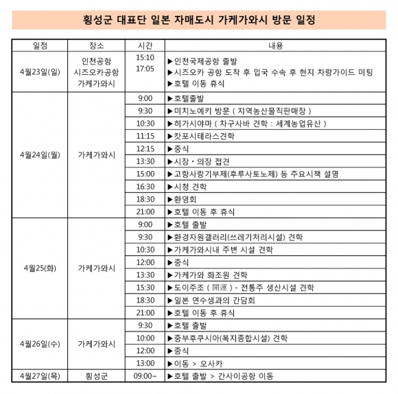 또 “횡성군 방문단은 출국시에는 가케와시의 시즈오카 공항으로 출국하였으나 귀국시에는 비행기편이 마땅치 않아 가케가와시에서 4시간가량 소요되는 오사카의 간사이공항으로 귀국했다”고 말했다.