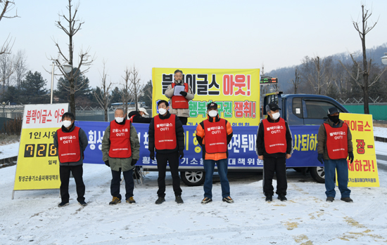 | ↑↑ 지난해 12월 군용기 소음피해를 호소하는 1인 시위 2주년을 맞아 공군제8전투비행단 정문 앞에서 횡성군이장협의회, 여성단체협의회, 번영회, 학부모단체, 공무원노조, 원주 소초면·호저면 주민들이 참여한 궐기대회가 열렸다. |