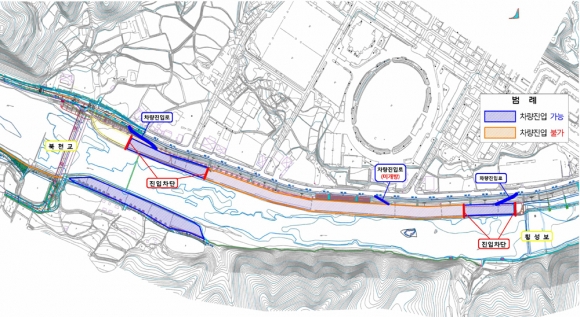차량 진입 제한 구간을 운영하고, 자전거도로 및 산책로 내 지장물(텐트 등) 설치를 제한(지속적 단속)한다. 잔디블록포장(3개소, 약 14,000㎡) 구간에 한해 차량진입(주차)을 허용한다.
