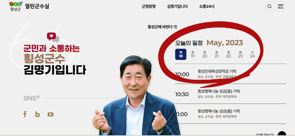 또 열린 군수실 첫 화면에는 군수의 일정이 5월 중순까지 표기되어 있었고, 클릭해야만 해당 달로 넘어갔다. 사진으로 횡성을 홍보하는 카드뉴스도 사정은 마찬가지로 5월 중순 이후 사진이 멈춰있었다.