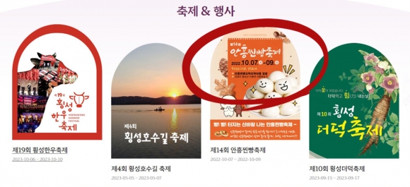 횡성관광 홈페이지에는 올해 제15회 안흥찐빵축제(10월13일∼15일) 일정이 확정된 지 한참 되었는데도 아직도 지난해 포스터와 일정을 홍보하고 있었다.