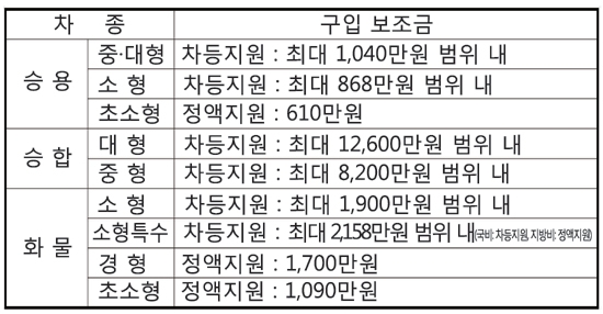 지원대상 차종은 승용(중·대형, 소형, 초소형), 화물(소형, 소형특수), 화물(경형, 초소형), 버스(대형, 중형)이며, 하반기 추가 지원 규모는 총 40대(승용 20대, 화물(소형) 15대, 화물(경형) 5대)로 상·하반기 합쳐 승용 70대, 화물(소형) 50대, 화물(경형) 15대, 승합 1대가 보급될 예정이다.