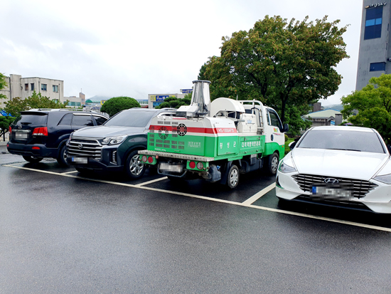 어김없이 지난 24일 오전 군청 현관 앞 제1민원주차장에 횡성군 로고와 함께 새겨진 ‘방역방제차’라고 적힌 차량이 주차되어 있었다.