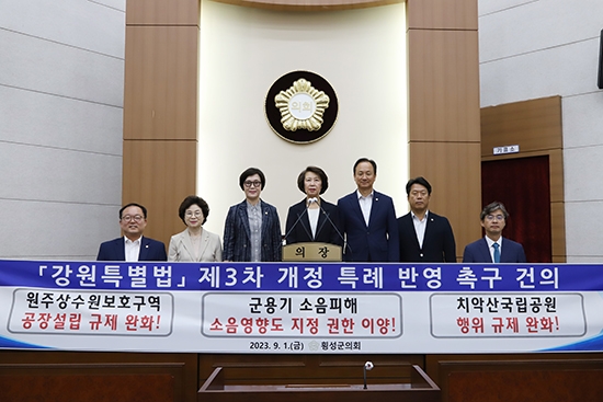 횡성군의회는 이번 건의안을 통해 △상수원보호구역 내 공장 설립 승인지역 및 승인요건 완화 특례 △소음영향도 지정 고시 권한 이양 특례 △자연환경지구 내 주민소득 창출 시설 설치 완화와 주민지원사업 범위 확대 특례를 강원특별법 3차 개정안에 반영할 것을 강력하게 촉구했다.