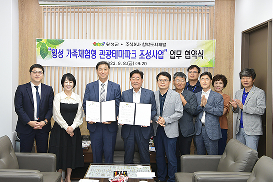 | 횡성군은 ㈜함박도시개발(대표 김인택)과 지난 8일 군수실에서 업무협약을 체결하고 횡성 가족체험형 관광테마파크 조성사업을 위한 상호협력을 약속했다고 밝혔다.