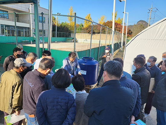 | ↑↑ 지난해 과수농가를 대상으로 토양만들기 실습 교육을 실시하고 있는 모습. / 자료사진 |