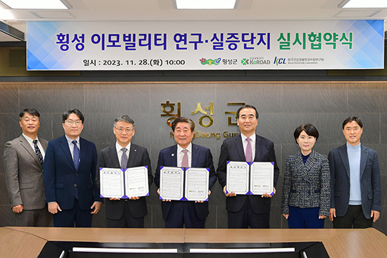 | 횡성군(군수 김명기)과 도로교통공단(이사장 이주민), 한국건설생활환경시험연구원(원장 조영태)은 지난 28일 횡성군청 소회의실에서 이모빌리티 연구·실증단지 조성을 위한 실시협약을 체결했다.
