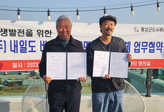 협약식은 둔내면 주민협의체 회장 이근석과 ㈜내일도바다 대표이사 노월용이 협약서에 서명하는 것으로 진행됐다.