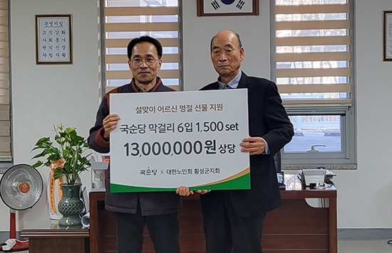 대한노인회 횡성군지회(지회장 전성택)는 지난 30일 횡성 대표 기업인 국순당에서 관내 192개 경로당 어르신을 위한 설맞이 명절 선물 막걸리(1,300만원 상당)를 전달받았다.
