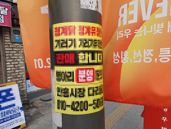 | ↑↑ 전봇대에 불법 광고물이 덕지덕지 붙어있다 |