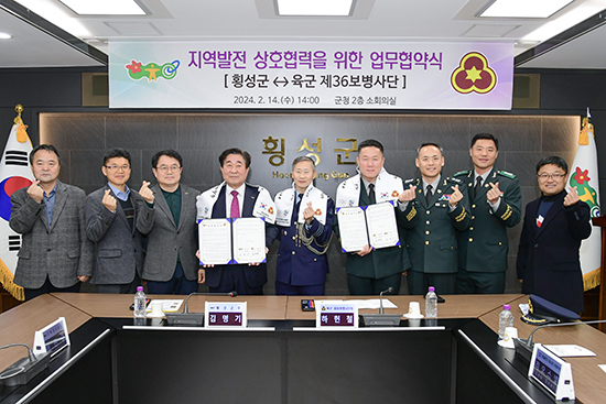 | 횡성군은 육군 제36보병사단(사단장 하헌철)과 지난 14일 군청 소회의실에서 지역발전 상호협력을 위한 업무협약을 체결했다.