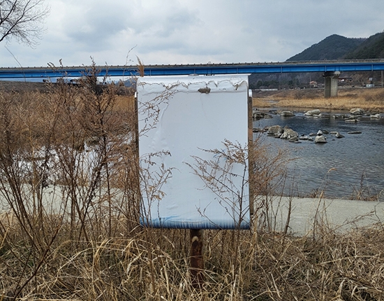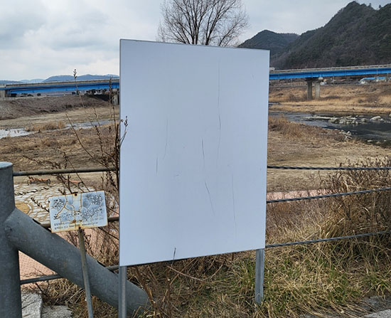 섬강과 전천의 합류 지점 횡성공공하수처리시설 근처에 있는 문예로의 인도지점과 강변 산책로 두 곳에 안내문이 지워져 내용을 알 수 없는 안내판이 방치되고 있어 지나다니는 시민들의 눈살을 찌푸리게 하고 있다. |
