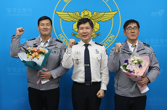 최주영, 이훈의 경위는 지난달 18일 갑천면 순찰 중 축사화재를 발견하고 119신고 및 차량에 비치하고 있는 소화기로 초기화재진압에 기여했다.