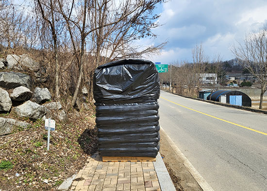 마산리 414-1번지, 말미교차로 남쪽 약 150m 마산로 지점에 누군가에 의해 적치된 영농자재가 인도를 막고 있어 주민들의 눈살을 찌푸리게 하고 있다.