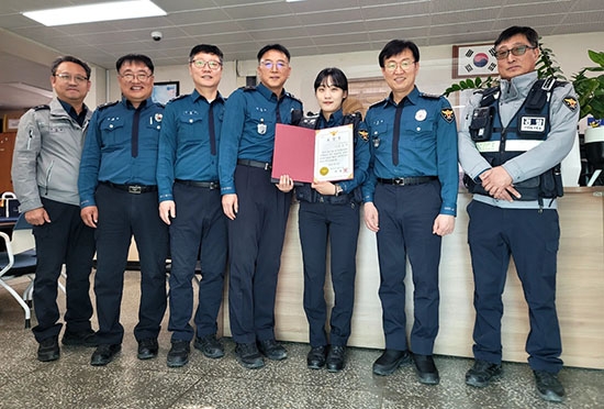 | ↑↑ 지난 18일 이동권 경찰서장은 둔내파출소를 방문해 임은지 순경에게 중요범인검거 표창장을 수여했다. |