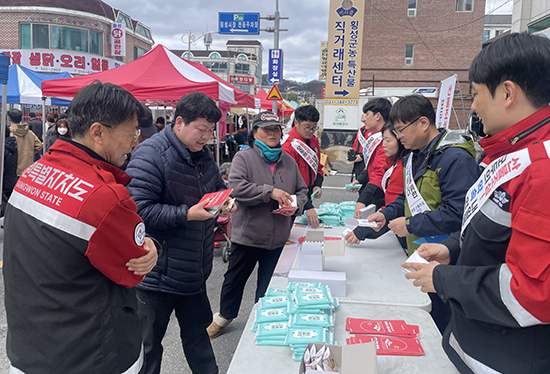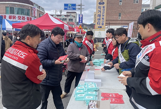 | 건조한 봄 날씨가 이어짐에 따라 개인 부주의로 인한 산불을 방지하기 위해 강원특별자치도(산불방지센터 영서분소)와 산림조합과 함께 지난 26일 횡성오일장에서 합동 산불 예방 캠페인을 펼쳤다.