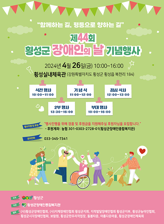 | 횡성군이 주최하고, 횡성군장애인종합복지관(관장 박성길)이 주관하며, 횡성관내 10개의 장애인 유관단체(기관)에서 협력기관으로 참여하는 ‘제44회 횡성군 장애인의 날 기념행사’가 오는 4월 26일 오전 10시 횡성실내체육관에서 진행된다.