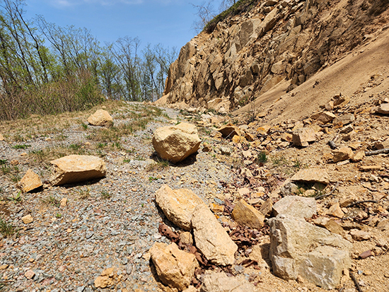 | 둔내면 삽교리 임도 곳곳에 낙석이 떨어져 있어 정비 작업이 시급하다.