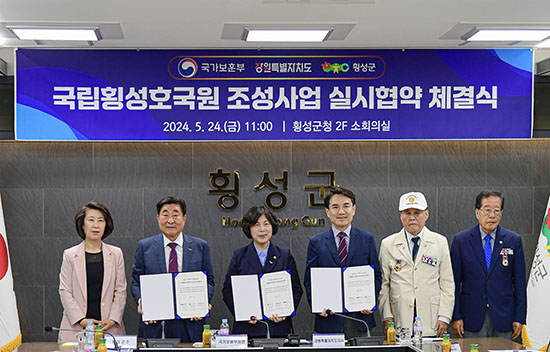 | 횡성군은 국립횡성호국원 조성 사업의 원활한 추진을 위해 지난 24일 횡성군청에서 국가보훈부와 강원특별자치도와 기관 간 의무이행과 협력 사항을 내용으로 하는 실시협약을 체결했다.