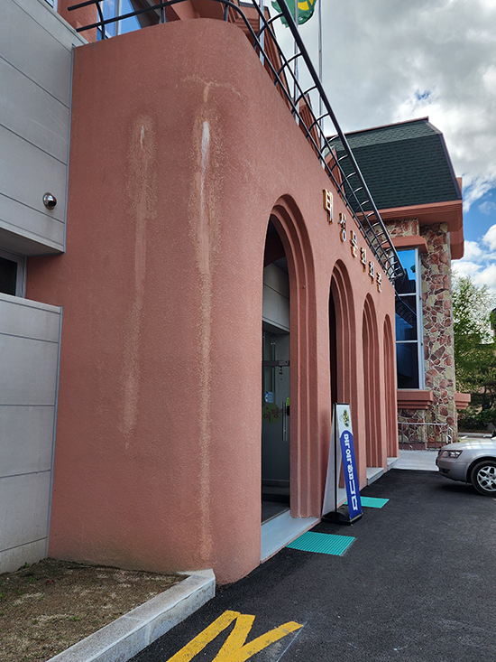 물이 새는 벽면은 임시로 페인트를 씌워 눈가림하고 있으나 볼썽사나운 모습으로 방치되고 있다.