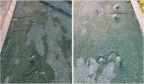 특히 이곳은 함께 건설된 상태가 비교적 양호한 주변의 고동색 포장도로와 비교해 볼 때 유독 심하게 훼손되어 있어 공사 당시 바닥 소재 선택에 문제가 있었거나 아니면 바닥 두께의 부실시공에 대한 합리적 의구심을 들게 한다. 관련 기관에서는 훼손이 더 진전되기 전에 조속히 보수하길 바란다.
