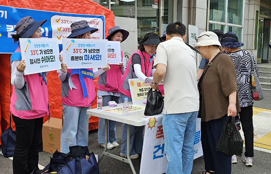 ‘건강한 여름나기’를 주제로 한 이번 캠페인에서는 ‘33℃가 넘으면 잠시만 쉬어요!’, ‘33℃가 넘으면 충분히 마셔요!’, ‘33℃가 넘으면 이웃을 살펴요!’라는 행정안전부의 수칙과 ‘부모님께 안부 전화하기’, ‘폭염 시 이웃 살피기’와 더불어 폭염 대비 건강 수칙인 물 자주 마시기, 시원하게 지내기, 더운 시간대에는 휴식하기 등의 내용을 담은 홍보물과 피켓을 활용해 홍보를 진행했다.
