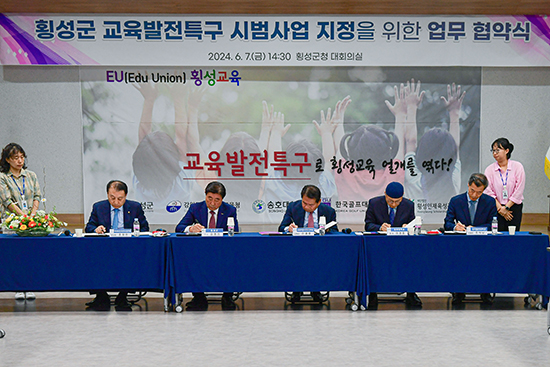 이날 협약식에는 김명기 군수, 신경호 강원특별자치도 교육감, 이경중 송호대학교 총장, 조석남 한국골프대학교 부총장, 조창진 횡성인재육성장학회 이사장이 참석해 교육발전특구 지정을 위한 상호 협력관계 업무협약을 체결했다.