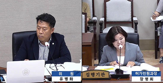 | ↑↑ 유병화 의원이 제321회 군의회 정례회 허가민원과 행정사무감사를 통해 횡성군이 LH강원본부의 건설보조금 지급 요구액에 대해 어떠한 노력도 하지 않은 채 지급키로 결정한 것에 대해 질책하고 있다. / 사진: 횡성군의회 인터넷방송 화면 캡처 |