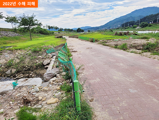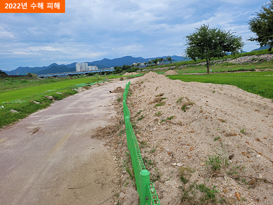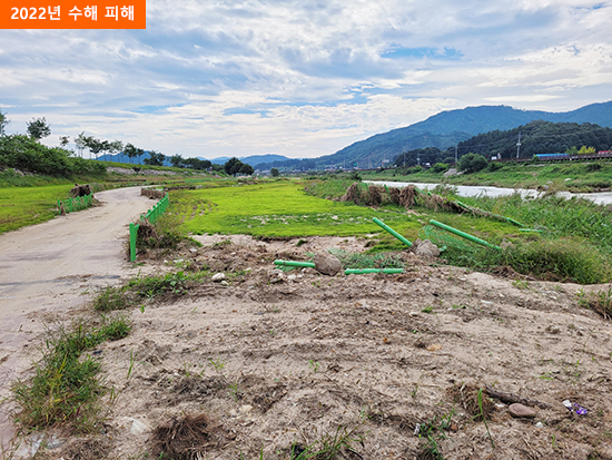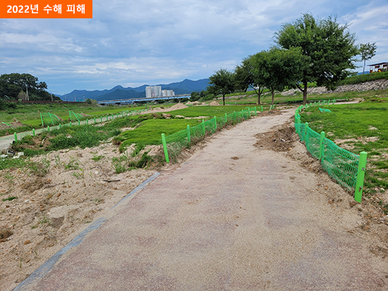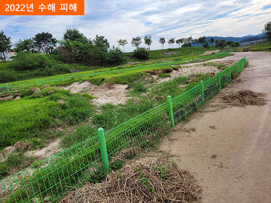 | ↑↑ 지난 2022년 8월 집중호우 시 파크골프장 대부분 시설이 수해 피해로 쑥대밭이 되었다. |