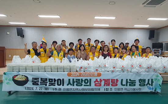 | 안흥면지역사회보장협의체(회장 원명숙)와 안흥면적십자봉사회(회장 마홍석)은 지난 22일 ‘러브인안흥 중복맞이 사랑의 삼계탕 나눔행사’를 통해 취약계층 120가구에 삼계탕을 제공했다.