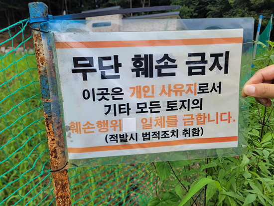 | ↑↑ 군 예산을 들여 포장된 시멘트 도로 곳곳에 개인 사유지 임을 표시하는 안내문이 붙어있다. |