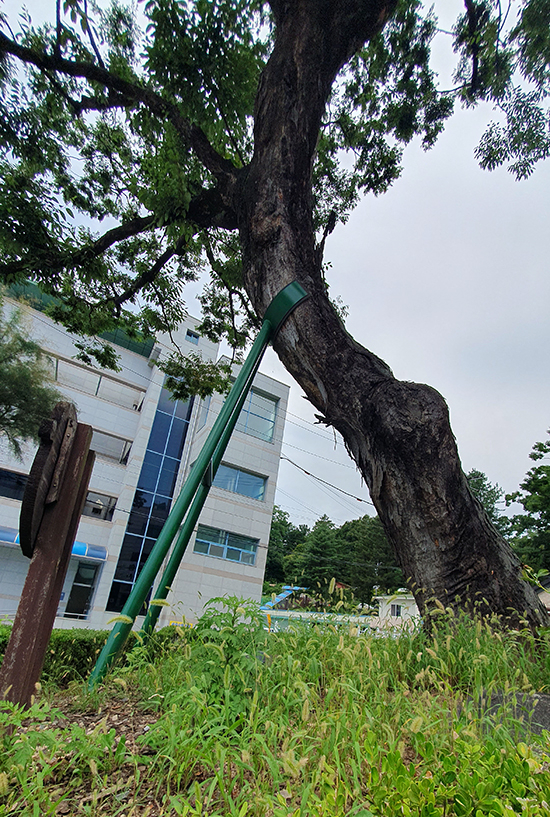 | ↑↑ 지난 6일 횡성군청 허가민원과 앞, 수령 250년된 느티나무 보호수 주변에 잡초가 무성하게 자라고 있어 관리가 필요해 보인다. |