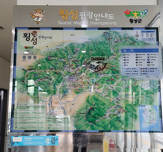 | ↑↑ 횡성버스터미널 내에 설치된 관광안내도는 루지체험장이 표기되어 있지 않고 오래전 문을 닫은 횡성온천이 표기돼 있다. |