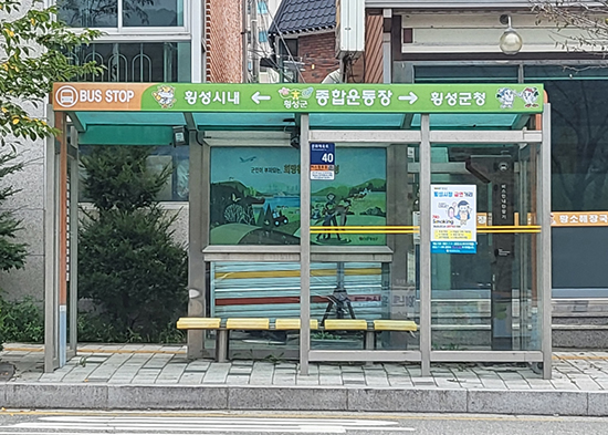| ↑↑ 종합운동장 버스정류장(사진 우측은 BIS, 좌측은 버스 시간표가 부착되어 있다. |